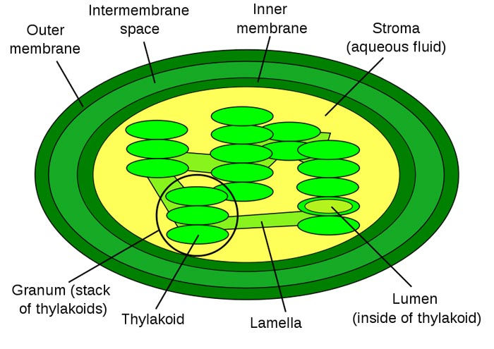 Structure of a Chloroplast: The structure of a chloroplast is closely related to its function. It has a double membrane that protects the organelle and controls what enters and exits. Inside the chloroplast is a fluid-filled region called the stroma, where glucose is formed during photosynthesis. Within the stroma are flattened sacs known as thylakoids, which are stacked into structures called grana. The thylakoids contain chlorophyll and are the site where light energy is absorbed. This organized structure allows photosynthesis to occur efficiently.